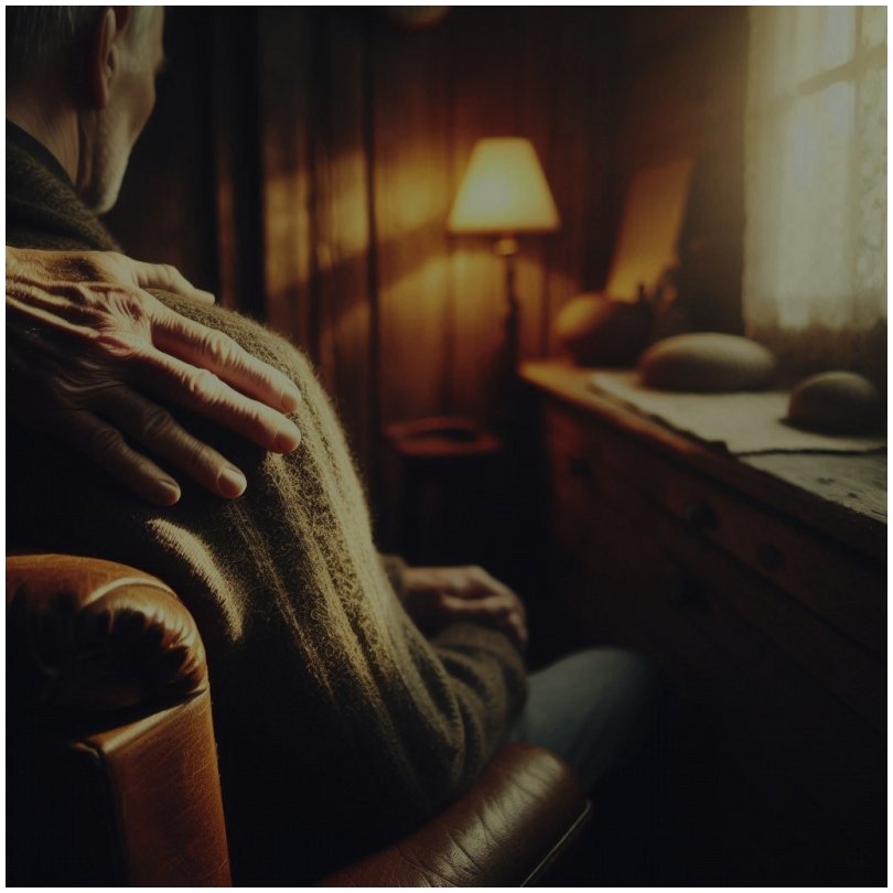 Der alte Mann saß still in einen kleinen Zimmer im Pflegeheim.