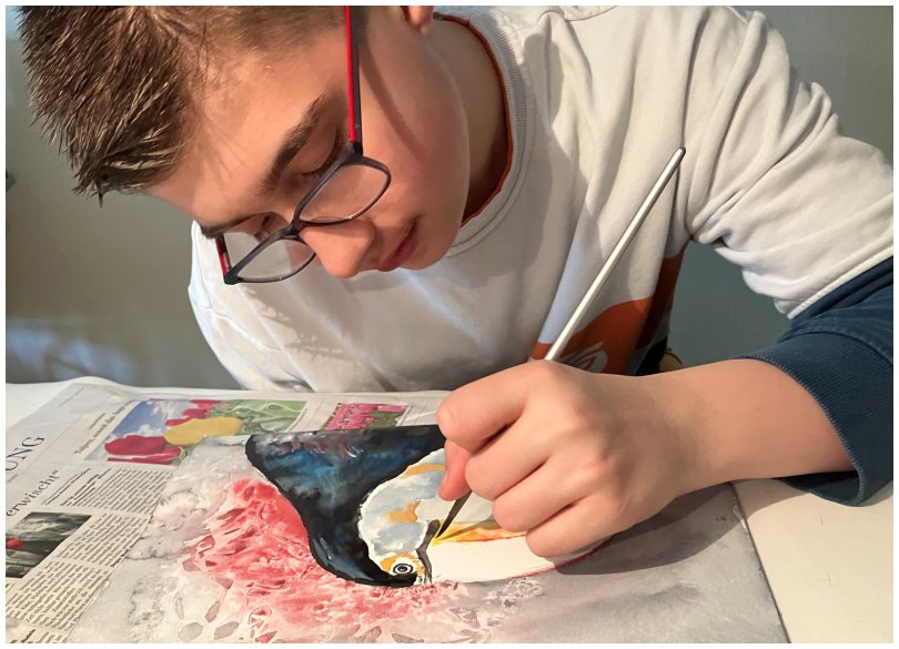 Der Fünfzehnjährige nickt verständnisvoll und feuchtet das Blatt an. Lennox mischt schon die grüne Farbe an und möchte das Auto giftgrün ausmalen. Sie erklärt ihm, wie er mit der Farbe umgehen soll. „Du musst die Farbe erst etwas anfeuchten, damit sich die Farbpigmente lösen und auch bitte sehr sparsam mit der Farbe umgehen. So ein kleines Farbnäpfchen kostet inzwischen fast fünf Euro“, erklärt sie dem Jungen. Lennox ist sprachlos, das hätte er nicht erwartet.